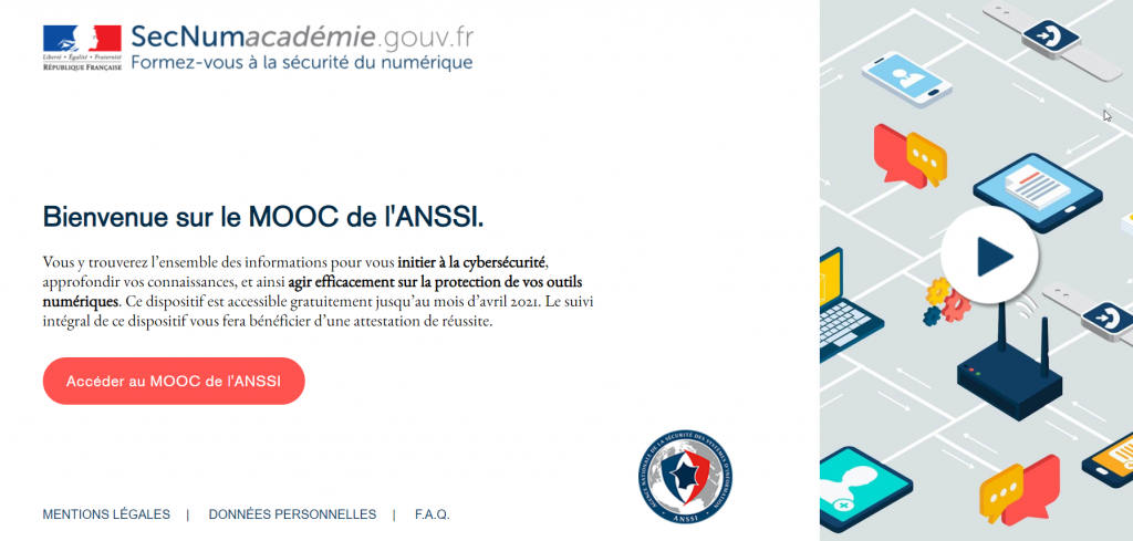 Le MOOC de l’ANSSI est un cours sur la sécurité des systèmes d’information, permettant d’attester d’une sensibilisation aux problématiques de la sécurité des systèmes d’information, et de ses acteurs. Les cours sont disponibles gratuitement et accessibles à tous. C’est une formation non-certifiante.
