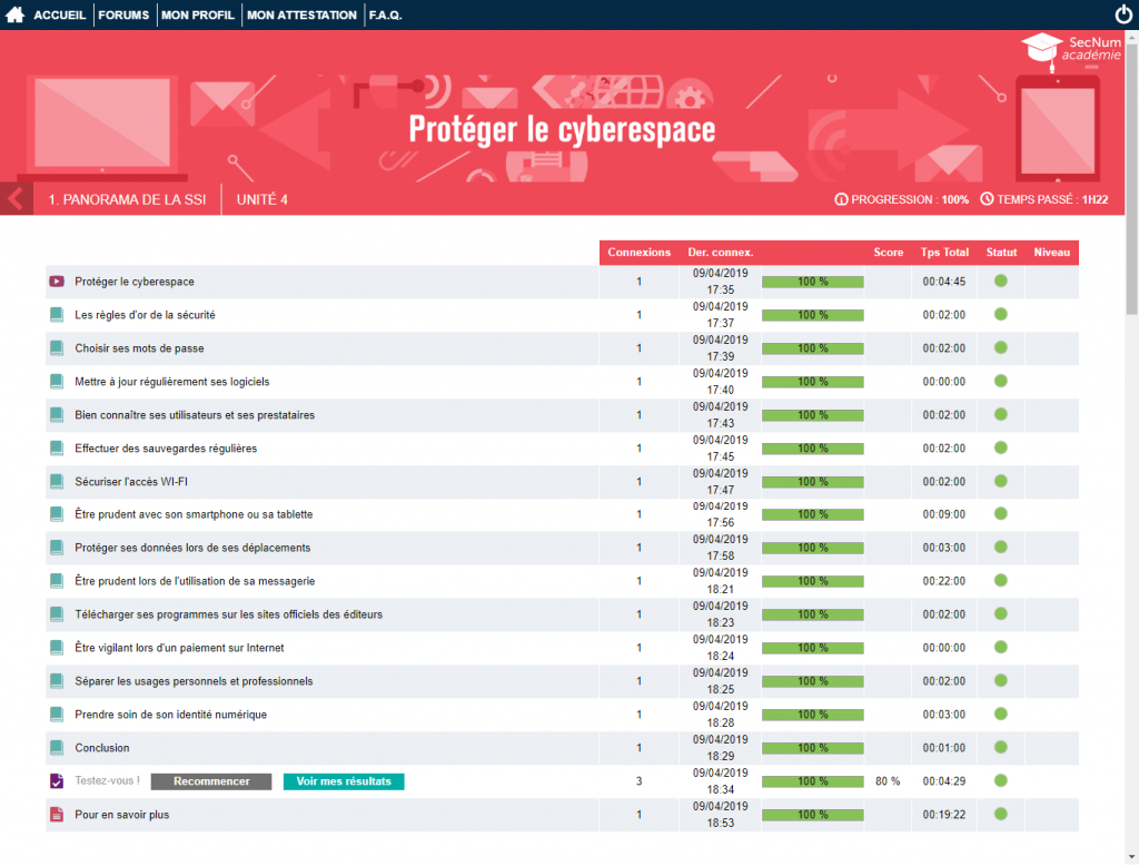 Une ne fois que vous aurez validé tous les modules pourrez télécharger une attestation de suivi au format PDF qui ressemble à ça :