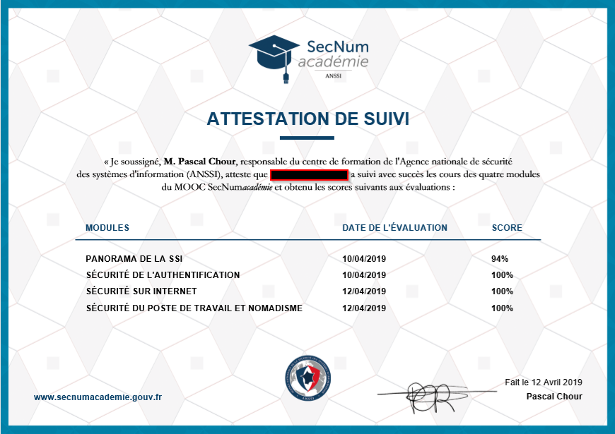 Peut-être vous a-t-on parlé du MOOC de l’ANSSI (Agence Nationale de la Sécurité des Système d’Information), certaines entreprises exigent que vous le passiez au début de votre intégration. Initialement gratuit jusqu'en Avril 2019, sa "durée de vie" a été rallongée jusqu'à Avril 2021. Un MOOC complet qui se caractérise essentiellement en un