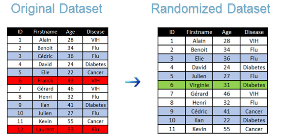 L’anonymisation est une méthode assez vaste sur laquelle on pourrait s’étendre des heures mais je vais simplement me contenter d’en expliquer les bases. Elle se décompose en deux grandes familles que sont la randomisation et la généralisation. Ces deux méthodes ont pour principale ligne de mire le fait de « flouter » les informations. La randomisation va altérer un jeu de données initial (typiquement la liste des employés d’une entreprise avec leurs salaires) en utilisant des méthodes telles que l’ajout de bruit, la permutation ou la suppression. Un exemple de jeu de données randomisé :