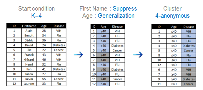 La généralisation, quant à elle, ne va pas altérer le jeu de données initial mais va se contenter de le rendre suffisamment flou pour avoir seulement 1 chance sur X (avec X à définir) de remonter à la source. Les méthodes principalement utiliser sont le k-anonymat et la l-diversité mais ne m’étalerai pas dessus. En voici simplement un exemple d’application :