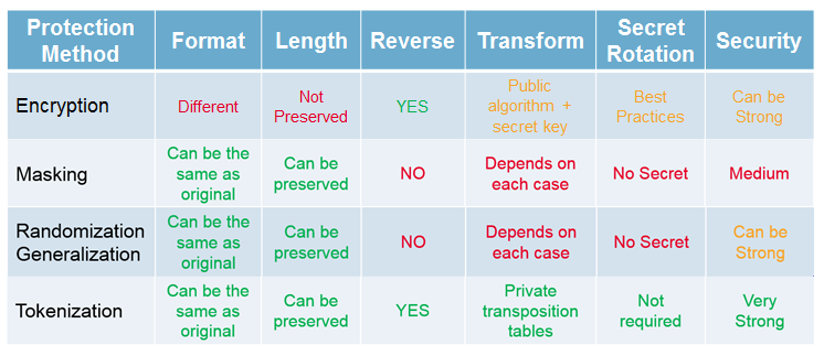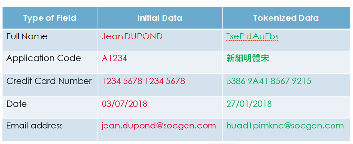 La tokenization est assez récente et innovante. Elle propose de transformer une donnée sensible en un « token » ayant aucune valeur intrinsèque. Elle est réversible et permet également de conserver la longueur et le format initial. Elle est basée sur une méthode de transposition de tables dynamiques afin de ne pas avoir à gérer les clés secrètes et leurs rotations augmentant également la sécurité de l’algorithme dû fait qu’il soit inconnu d’un éventuel attaquant, contrairement au cas du chiffrement où un attaquant n’aurait « que » la clé à trouver. L’exemple le plus classique de tokenization est encore celui du numéro de carte bleue où l’on obtient en sortie un autre numéro de carte bleue de la même longueur mais qui lui n’a aucune valeur intrinsèque. On peut également se contenter de ne protéger qu’une partie de la donnée, dans le cas des dates de naissance ou des mails par exemple. Encore, on peut décider que le format de la donnée initiale ne nous intéresse pas et que l’on souhaite simplement le rendre illisible en remplaçant les caractères par d’autres. En voici quelques exemples classiques :