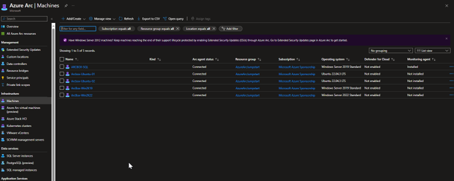 Et on constate dans Azure Arc que les serveurs sont bien remontés et que tout semble être configuré.